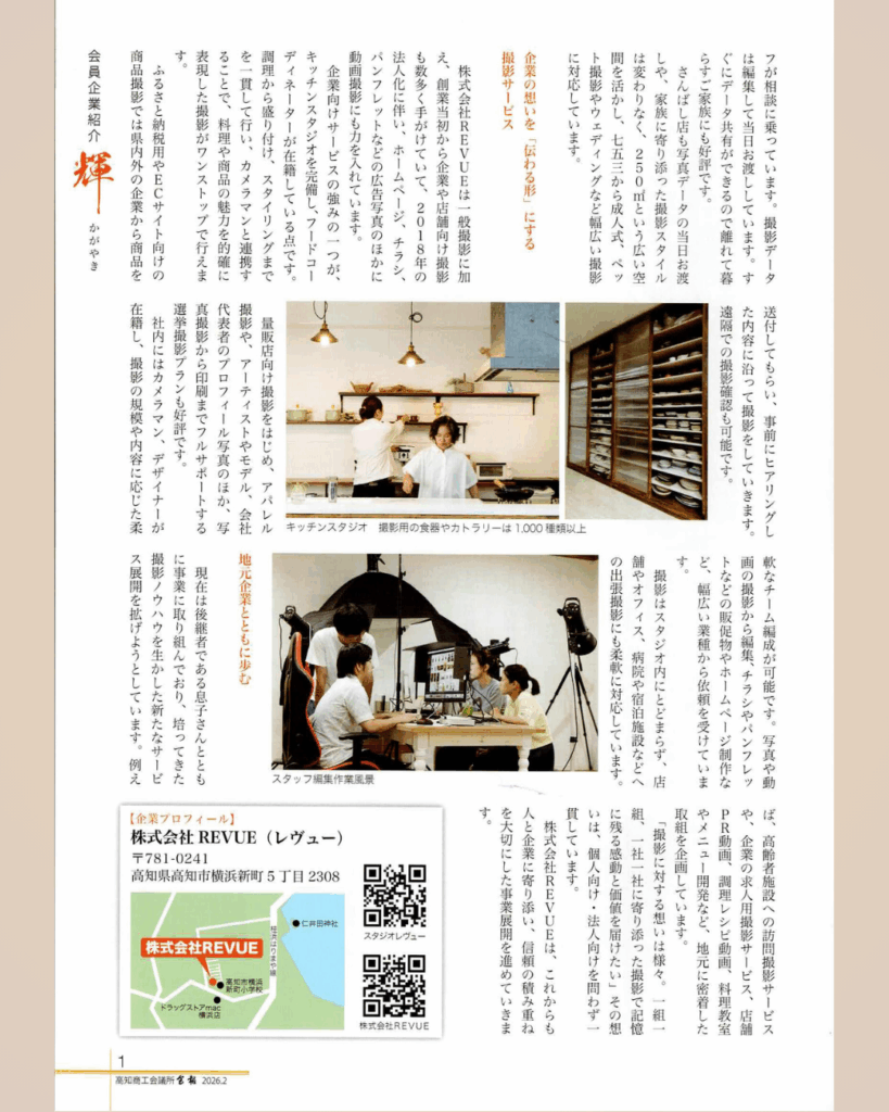 この度、高知商工会議所の会報誌(2月号)にてスタジオレヴューをご紹介していただきました👏